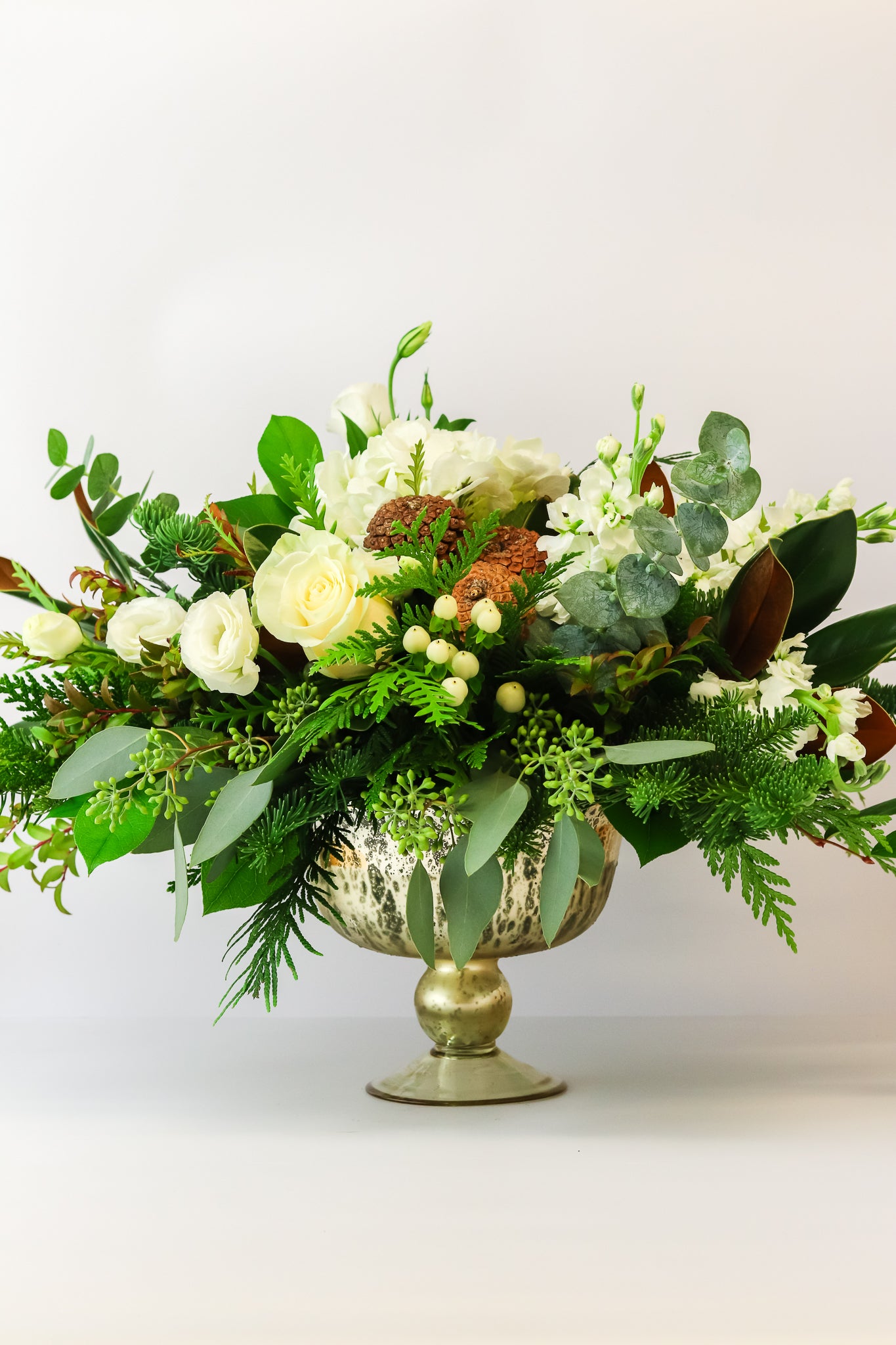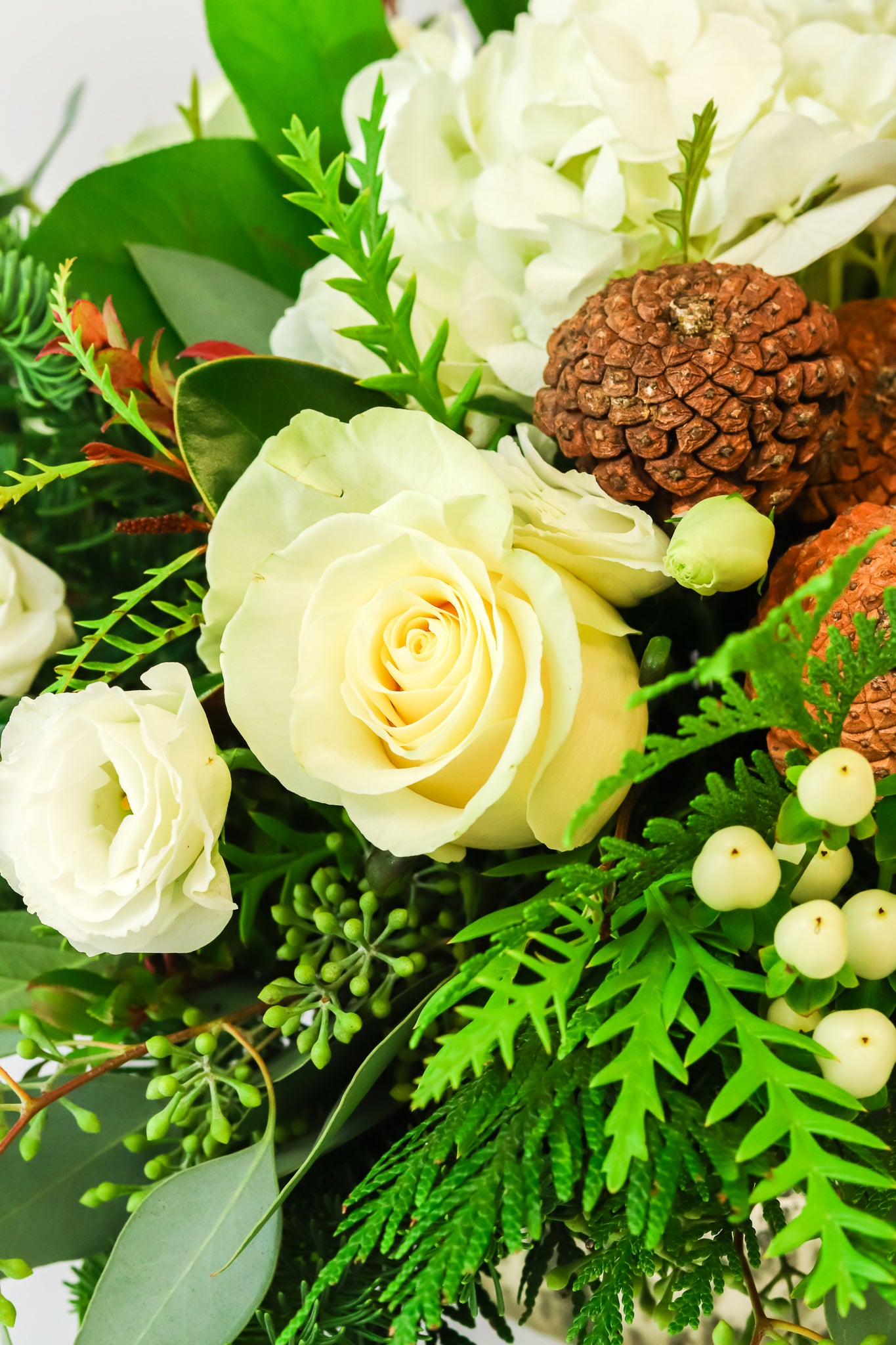 A truly stunning arrangement of white roses, hydrangea, eucalyptus and white hypericum berries. Surrounding by fresh greens and pinecones in a beautiful silver urn, this arrangement makes a wonderful holiday gift for that special someone.