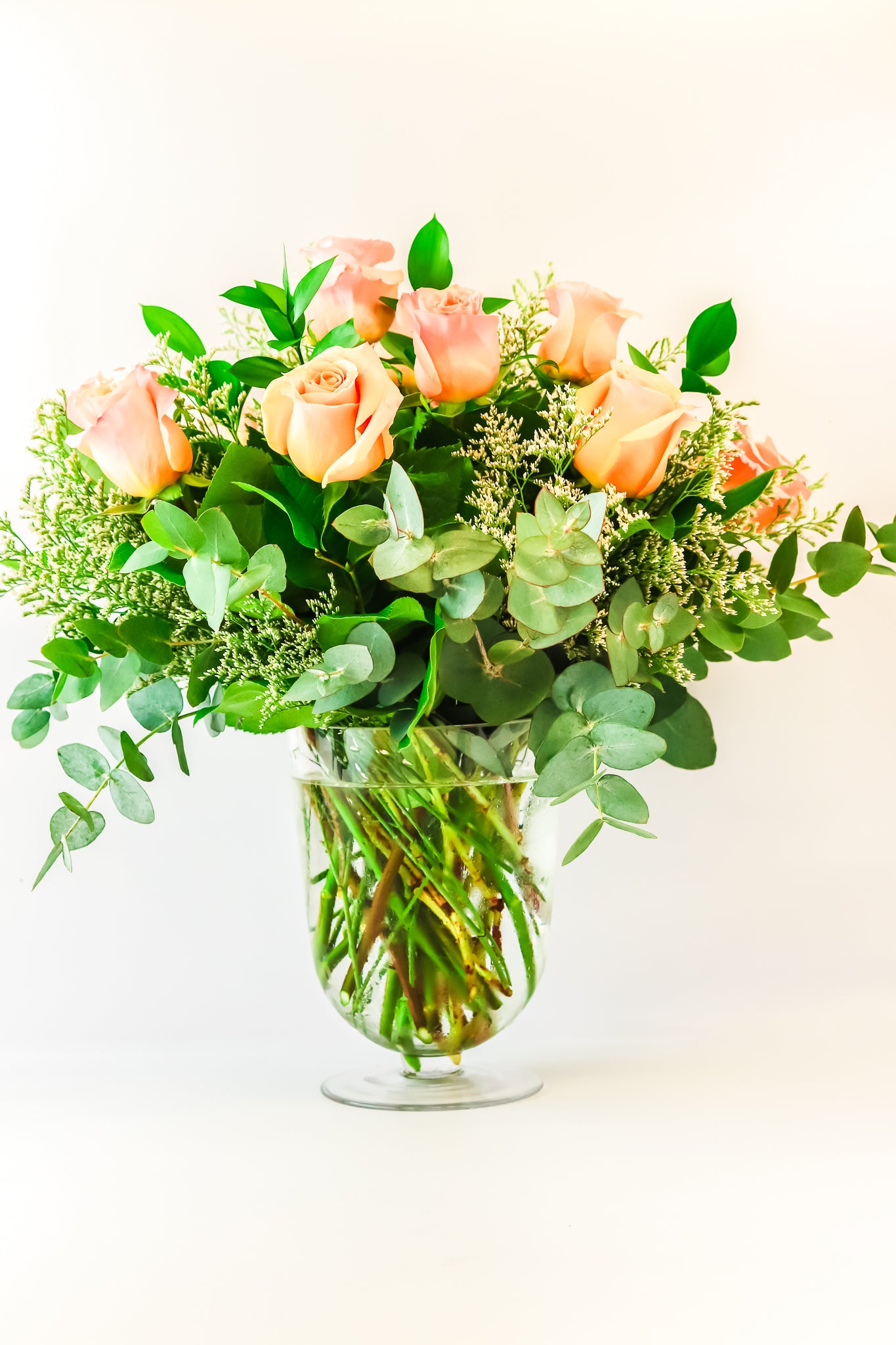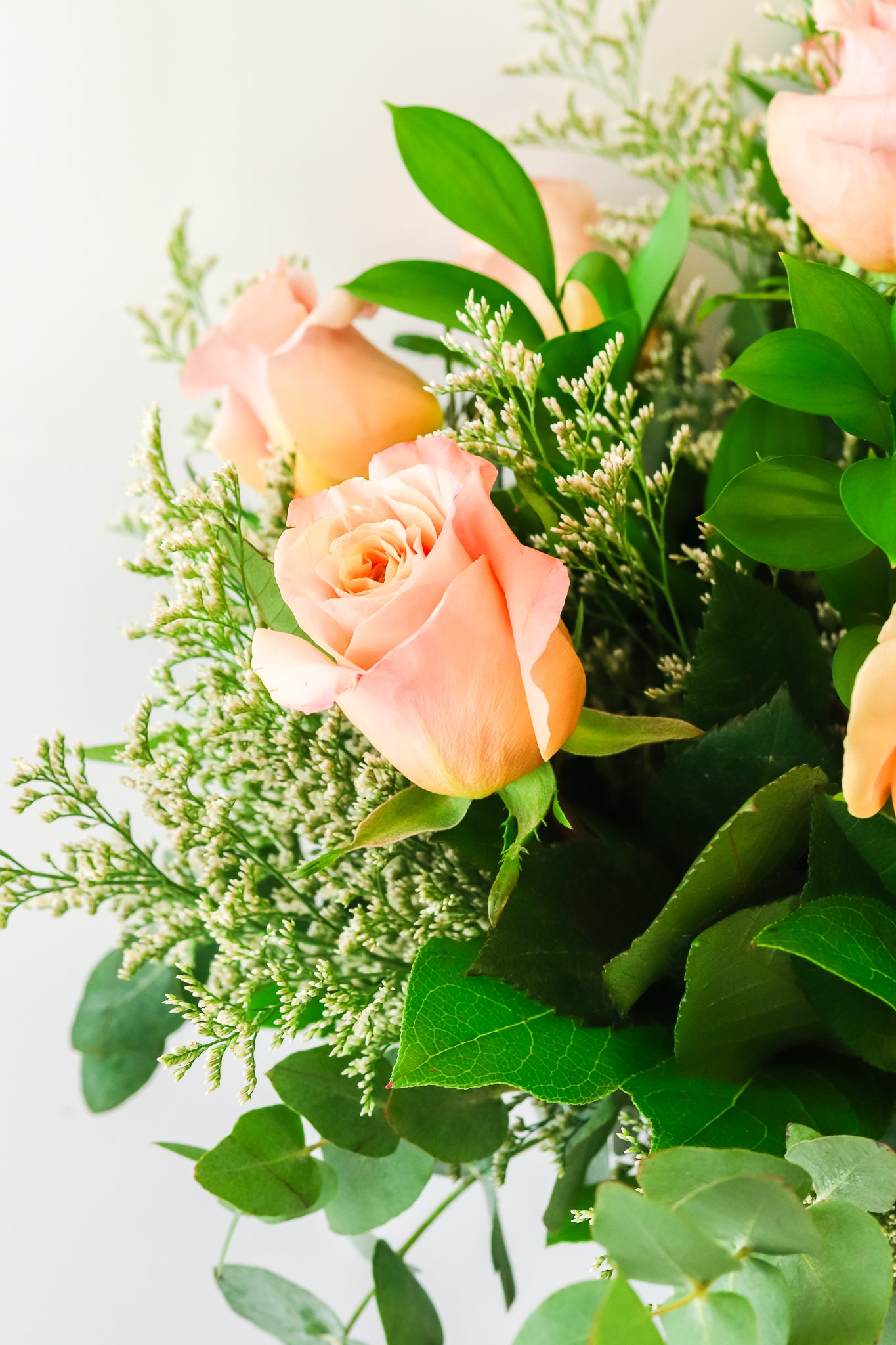 Indulge that special someone with a stunning arrangement of delicate pink roses surrounded with sprigs of fragrant eucalyptus and lovely greenery. This gorgeous bouquet is delivered in a simple glass vase.